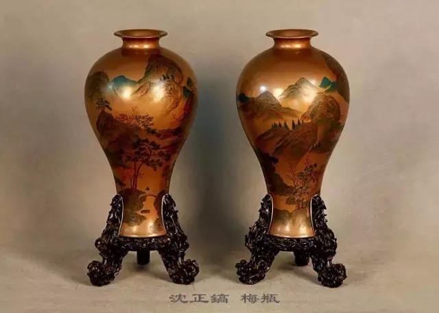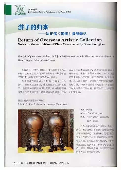 自沈紹安首創(chuàng)脫胎漆器起,其技藝代代族傳家承,故又有福州"沈氏脫胎漆器"之稱。1920年,沈紹安第五代孫沈正鎬、沈正恂把泥金和泥銀調(diào)到漆料當(dāng)中去,在原有紅、黑、朱、紫的髹漆技藝基礎(chǔ)上,新研制出金銀、天蘭、蘋果、蔥綠、古銅等顏色,使漆器表達(dá)的方式和手段得到全新的改變,做出來的作品達(dá)到了華麗輝煌、燦爛奪目的效果。1898年,沈正鎬、沈正恂選送脫胎漆器作品參加巴黎國際博覽會,并獲得金牌,從此福州脫胎漆器在國際工藝美術(shù)界嶄露頭角。接著,沈正鎬、沈正恂以及沈正愉、沈幼蘭等沈氏脫胎漆器世家產(chǎn)品先后選送參加意大利、美國、柏林、倫敦等地的博覽會展出,獲得了各種獎牌,聲譽大振。