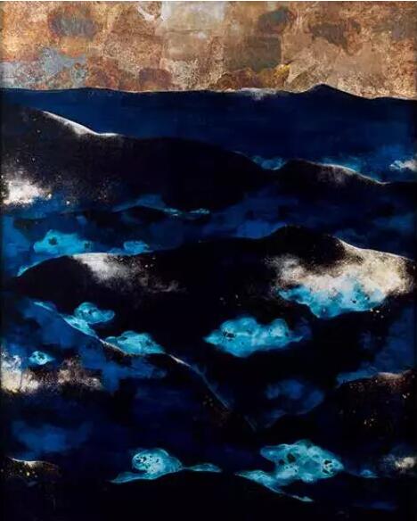 馬繼濤的漆作將金銀箔作為創(chuàng)作中一個(gè)重要的輔助材料,深入挖掘材料語言在漆畫內(nèi)各技法形態(tài),《伴云來》實(shí)現(xiàn)金銀箔與大漆對(duì)話。金銀箔薄如蟬翼,亮麗而不規(guī)則揉皺的紋理讓效果更有飽滿程度,使材質(zhì)的“視覺潛質(zhì)”得以浮現(xiàn),從中找出一種特別的表達(dá)形式,豐富美學(xué)意義上的審美知覺,進(jìn)而在物欲意識(shí)層面實(shí)現(xiàn)了詩(shī)意特征的情感化。再施以面漆,漸次金銀箔的亮度,光源的穿透形成了多重時(shí)空維度的交疊感,髹漆后畫面丘壑山巒富有光感的色澤,這份光的幻影在天空中仿佛霞光又猶如夕陽的最后一抹光亮,靜謐朦朧,衍生為風(fēng)景畫中一條生機(jī)勃勃的畫脈,它超越了之前以油畫、國(guó)畫材料表現(xiàn)中國(guó)傳統(tǒng)山水形態(tài)的面貌,轉(zhuǎn)而在材料本身用功,將大漆和金銀箔兩種媒介融而為一,統(tǒng)一于頗具現(xiàn)代形式意味的風(fēng)格意境中,呈現(xiàn)出一種平和開放的,超越了以往東西方文化、傳統(tǒng)與現(xiàn)代文化壁壘的心態(tài)。